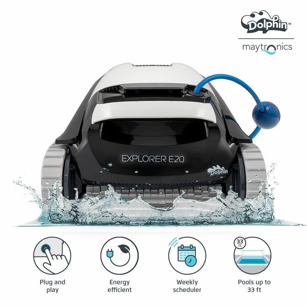 - Sit back and relax while the Dolphin Explorer E20 robotic pool vacuum cleans the pool for you. Ideal for in-ground swimming pools up to 33 feet, this easy to use, compact cleaner will have your pool ready for splashing fun in just 2 hours.