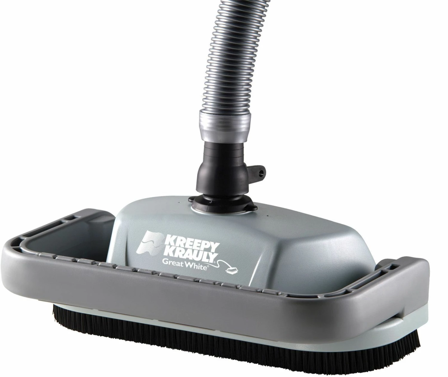 Take a big bite out of pool maintenance with the Kreepy Krauly GW9500 Great White Automatic Inground Pool Cleaner from Pentair Water Pool and Spa. This hungry guy is on the prowl scouring the depths for dirt and grime. Unlike other cleaners, the Great White scrubs and vacuums away the toughest dirt. Its patented bristle-drive mechanism has the strength to knock loose the most stubborn dirt, while the powerful vacuum action whisks away small and large debris.
