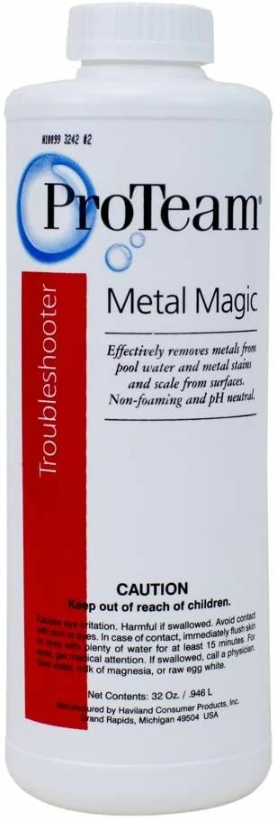 ProTeam Metal Magic effectively removes problems on pool surfaces from staining caused by metals; easily removes suspended metal particles from pool water.