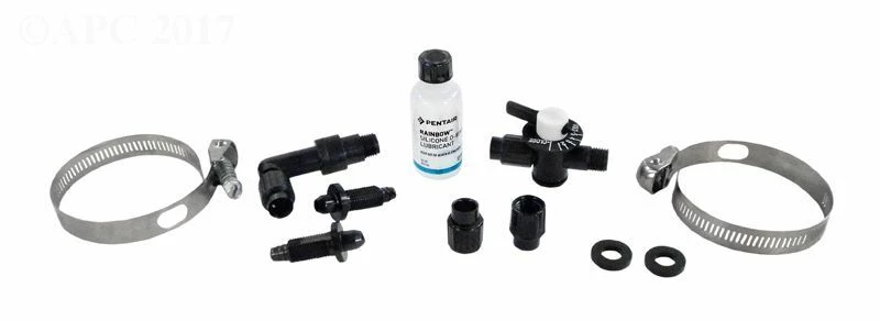 The Rainbow R172064 Chlorinator Parts Bag fits the Rainbow 300, 302, 300-19 and 300-29 automatic swimming pool and spa chemical feeders. The Parts Bag includes 2 tube fittings with nuts and gaskets, 2 saddle clamps, a flow valve, an elbow valve and a small bottle of silicone lubricant.