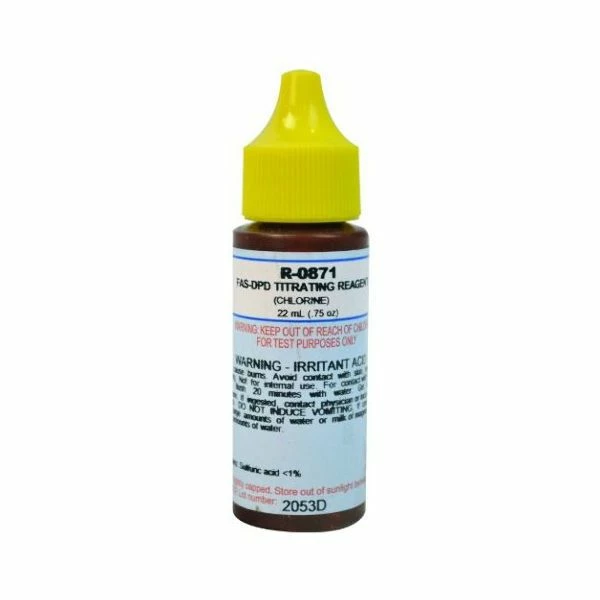The Taylor R-0871-A FAS-DPD Chlorine Titrating Reagent 3/4 ounce bottle is a direct replacement for FAS-DPD reagents in Taylor test kits. Test kit reagents should be stored in a cool, dry place out of direct sunlight and should be replaced at least annually.