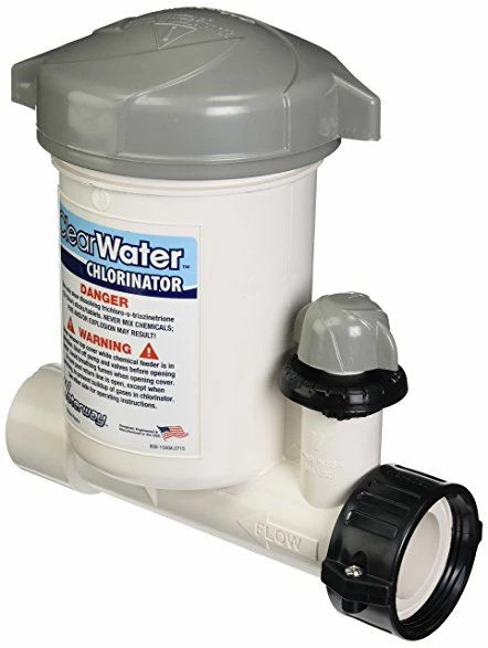 The Waterway CAG004-W ClearWater Automatic In-Line Chlorinator for Above Ground Pools provide safe and reliable swimming pool sanitation. The ClearWater has an improved durable flow valve for regulating chlorine or bromine flow allowing adjustments for more accurate settings. The dial has been moved making it easier to view and the external hose has been eliminated from the in-line model. The check valve prevents backflow of water into the chlorinator. This unit holds up to four 3″ chlorine tablets at one time.